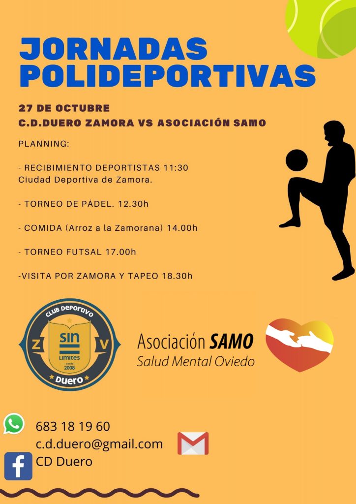 La Asociación Salud Mental Oviedo (SAMO) y el gimnasio Enjoy Oviedo, realizaran con motivo del día mundial de la salud mental unas actividades deportivas para personas con problemas de salud mental grave, donde se hará hincapié de la importancia que tiene el deporte para este colectivo, ya que la práctica asidua del ejercicio físico mejora la calidad de vida de estas personas, tanto física, psíquica y social, primero se proyectaran un video de presentación, unas palabras de las autoridades presentes y a continuación se llevaran a cabo las actividades deportivas.